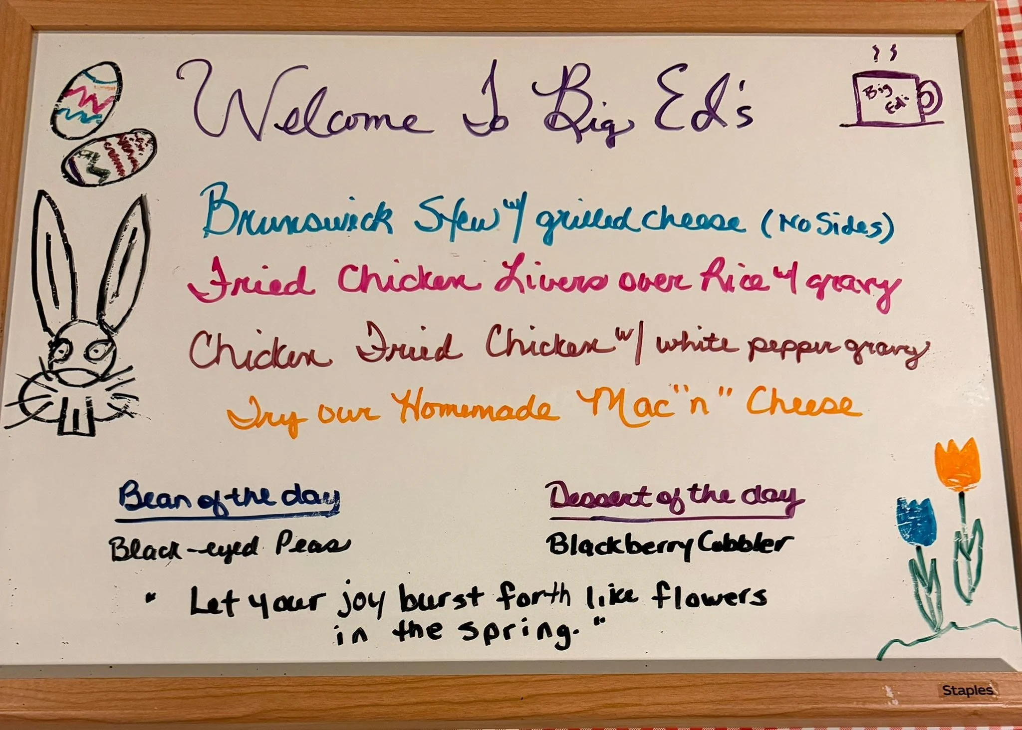 April 2, 2026 Big Ed's April 2, 2026 Big Ed's “Let your joy burst forth like flowers in the spring.”Downtown Raleigh’s Southern Country Cooking and Breakfast at its Best! Big Ed's