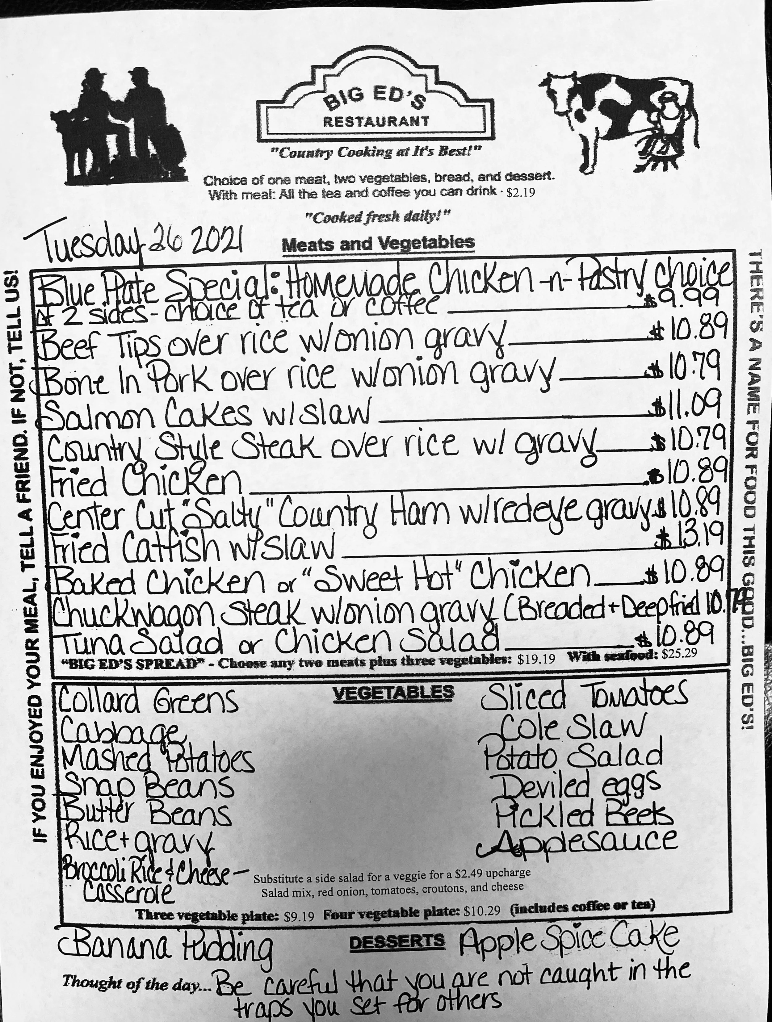 October 26, 2021 Big Ed's October 26, 2021 Big Ed's “ Be careful that you are not caught in the traps you set for others.” Big Ed's