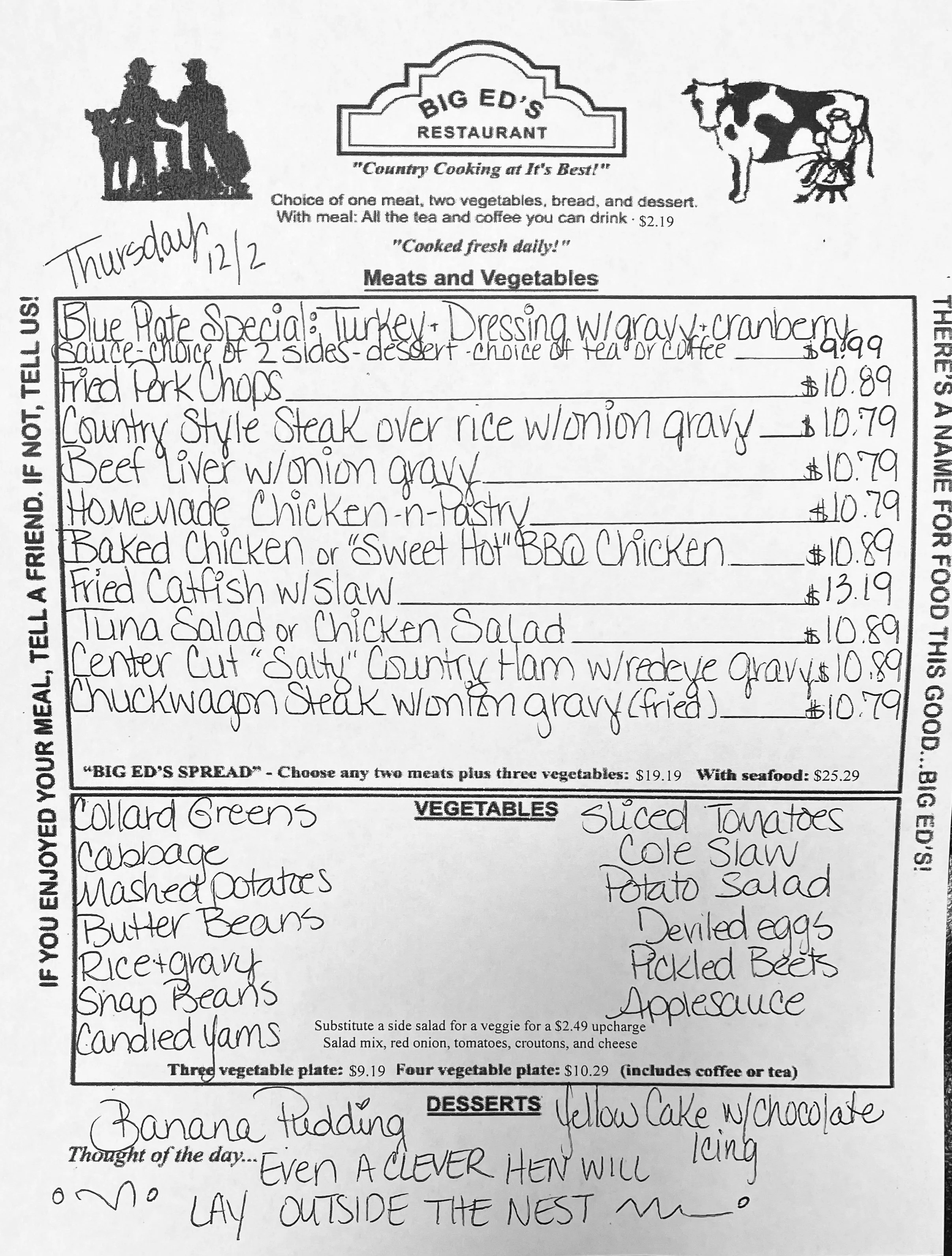 December 2, 2021 Big Ed's December 2, 2021 Big Ed's “ Even a cleaver hen will lay outside the nest.” Big Ed's