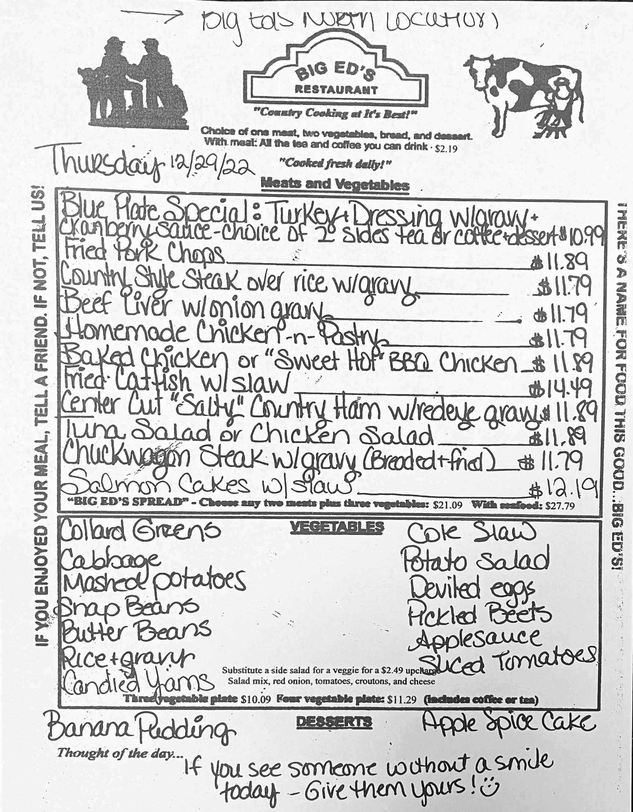 December 29, 2022 Big Ed's December 29, 2022 Big Ed's “ If you see someone without a smile today- give them yours.” Big Ed's