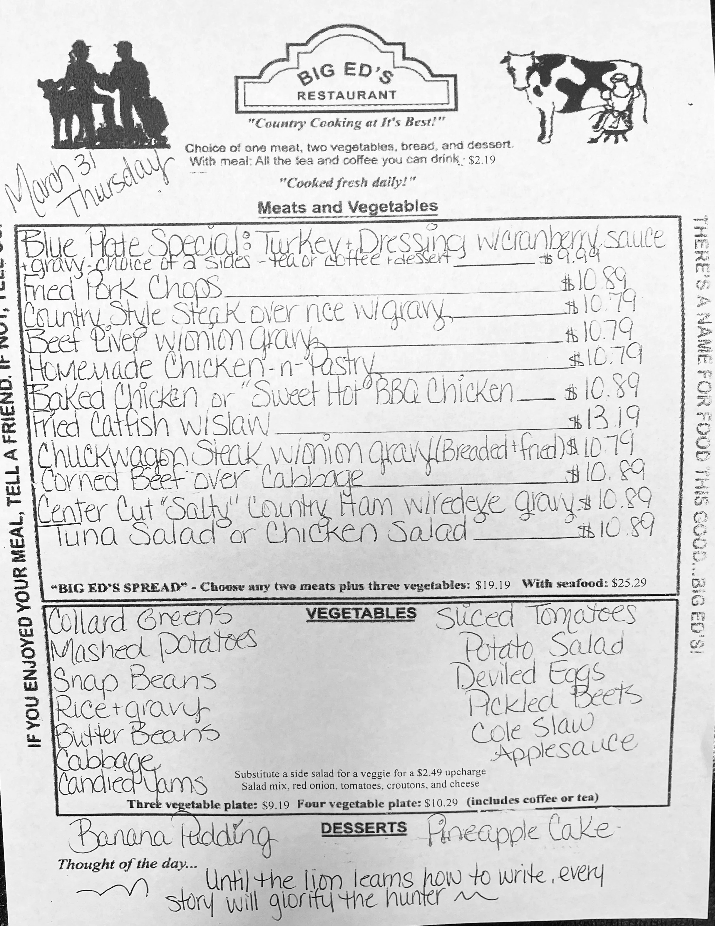 March 31, 2022 Big Ed's March 31, 2022 Big Ed's “ Until the lion learns how to write, every story will glorify the hunter.” Big Ed's