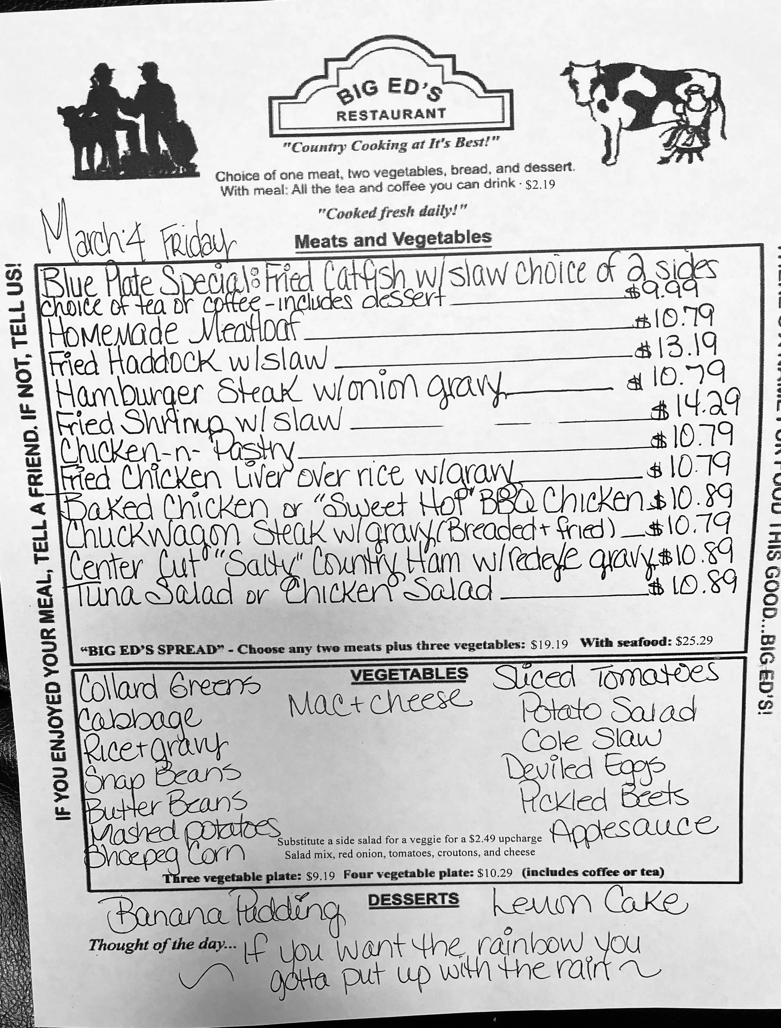 March 4, 2022 Big Ed's March 4, 2022 Big Ed's “ If you want the rainbow you gotta put up with the rain.” Big Ed's
