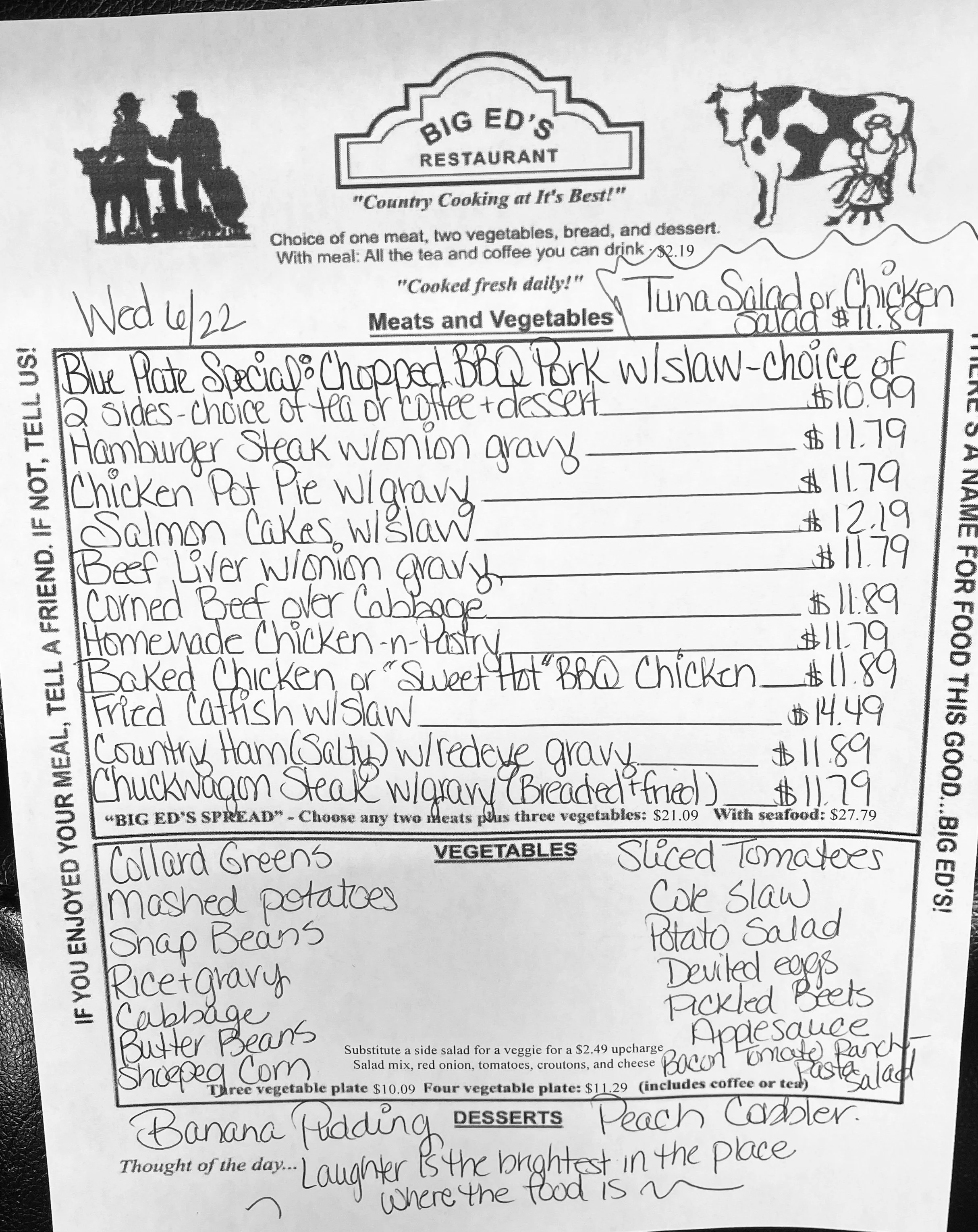 June 22, 2022 Big Ed's June 22, 2022 Big Ed's “ Laughter is the brightest in the place where the food is.” Big Ed's