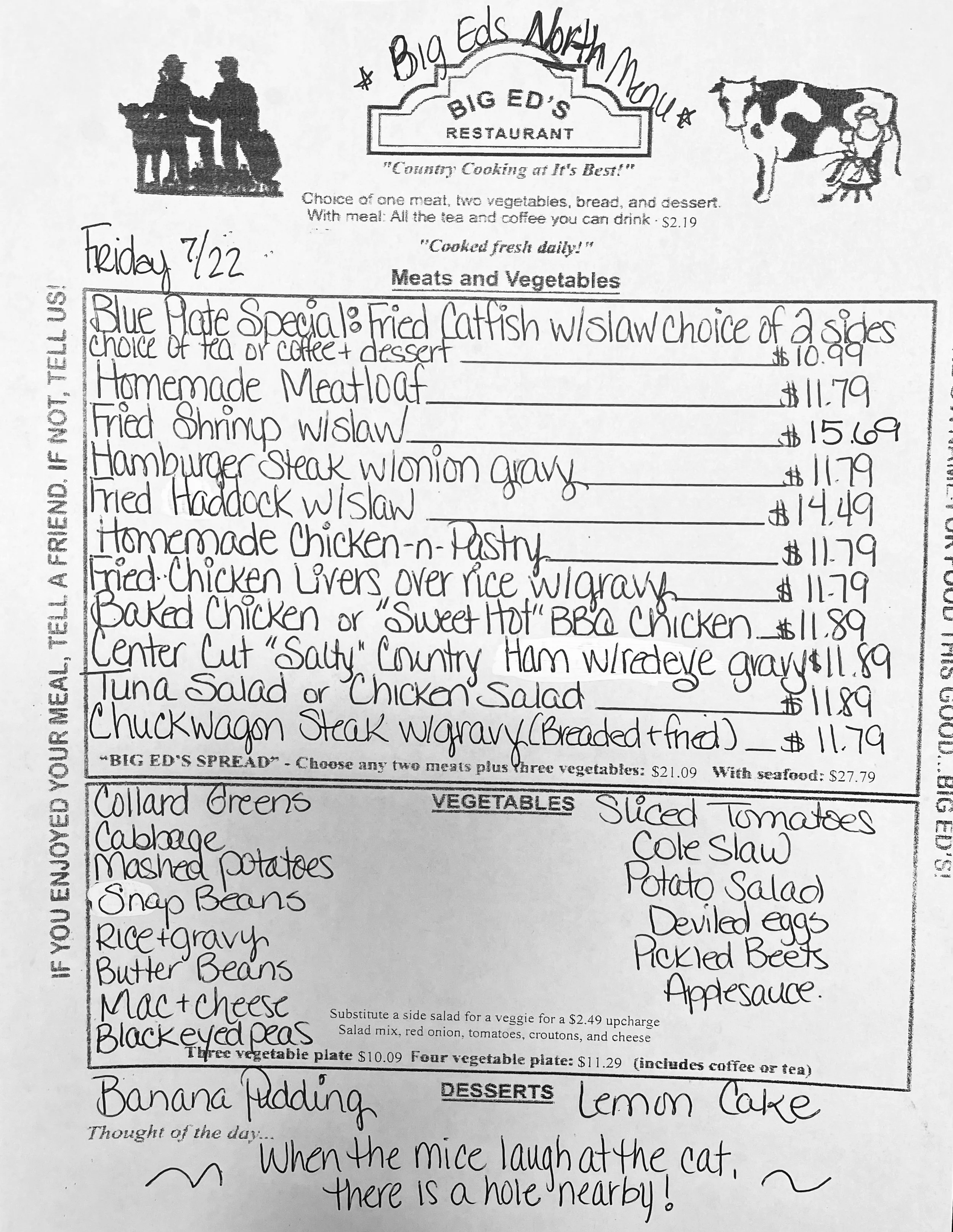 July 22, 2022 Big Ed's July 22, 2022 Big Ed's “ When the mice laugh at the cat, there is a hole nearby.” Big Ed's