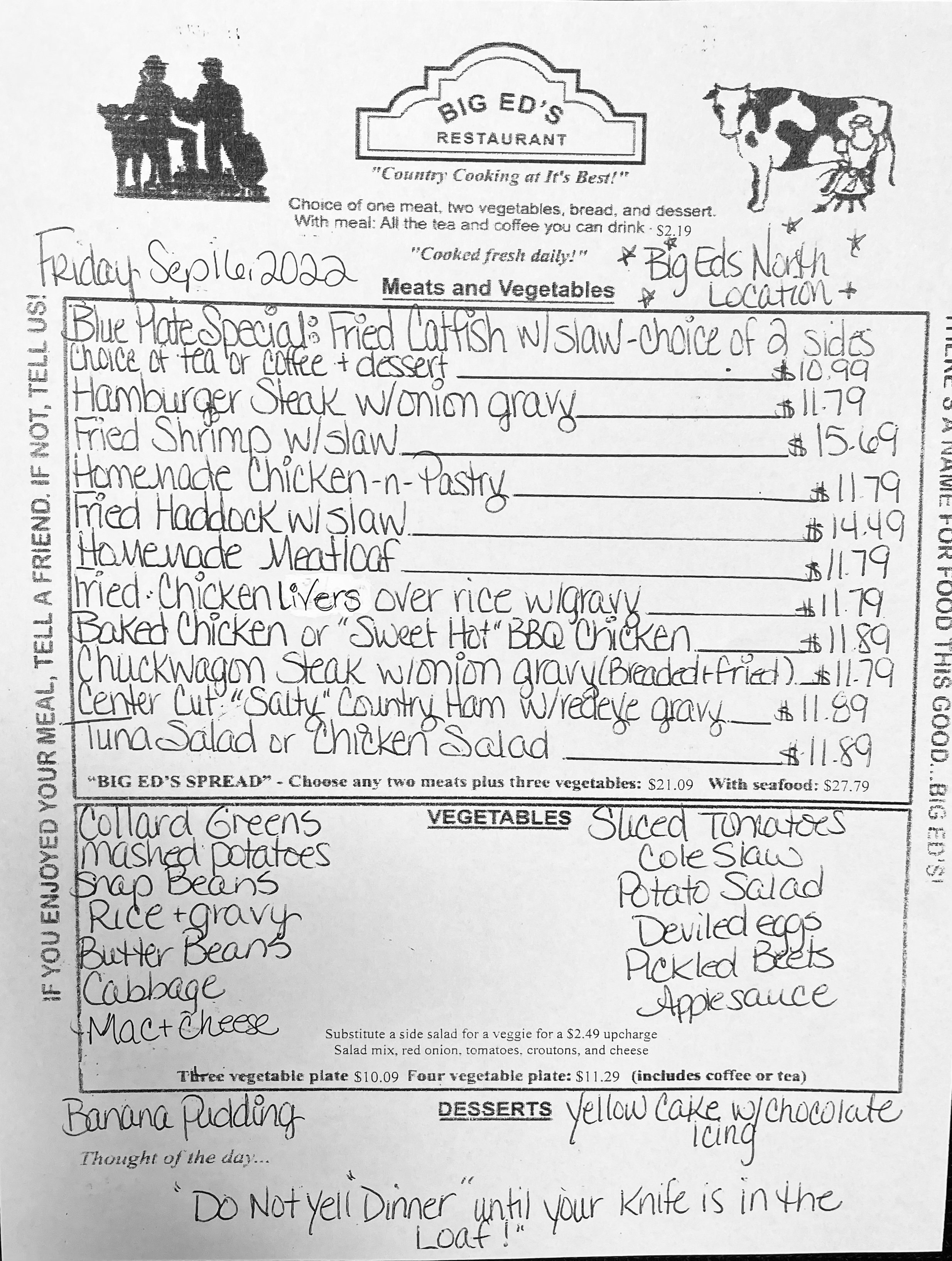September 16, 2022 Big Ed's September 16, 2022 Big Ed's “ Do not yell dinner until your knife is in the loaf.” Big Ed's