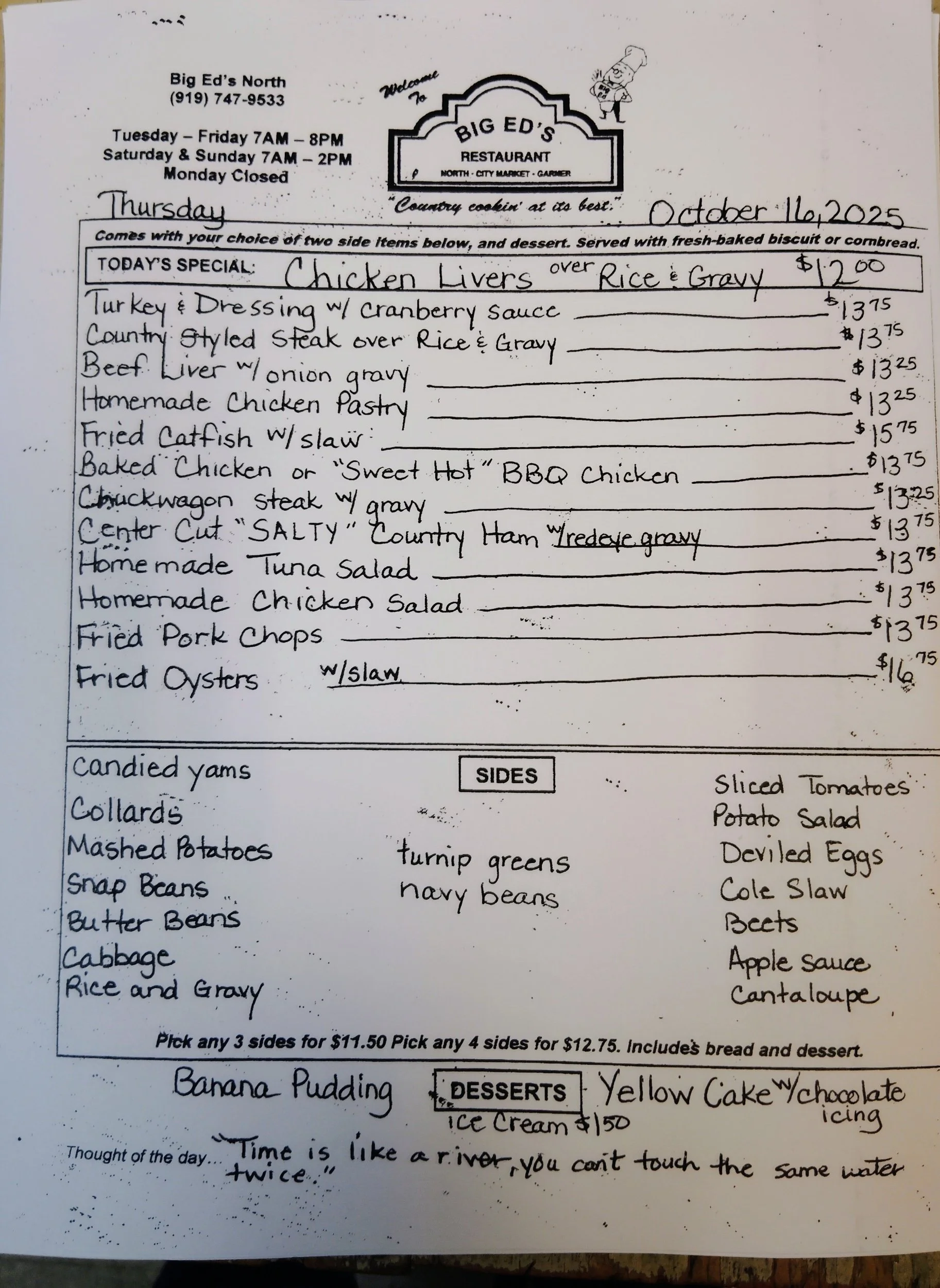 October 16, 2025 Big Ed's October 16, 2025 Big Ed's “Life is like a river, you can never touch the same water twice!” Big Ed's