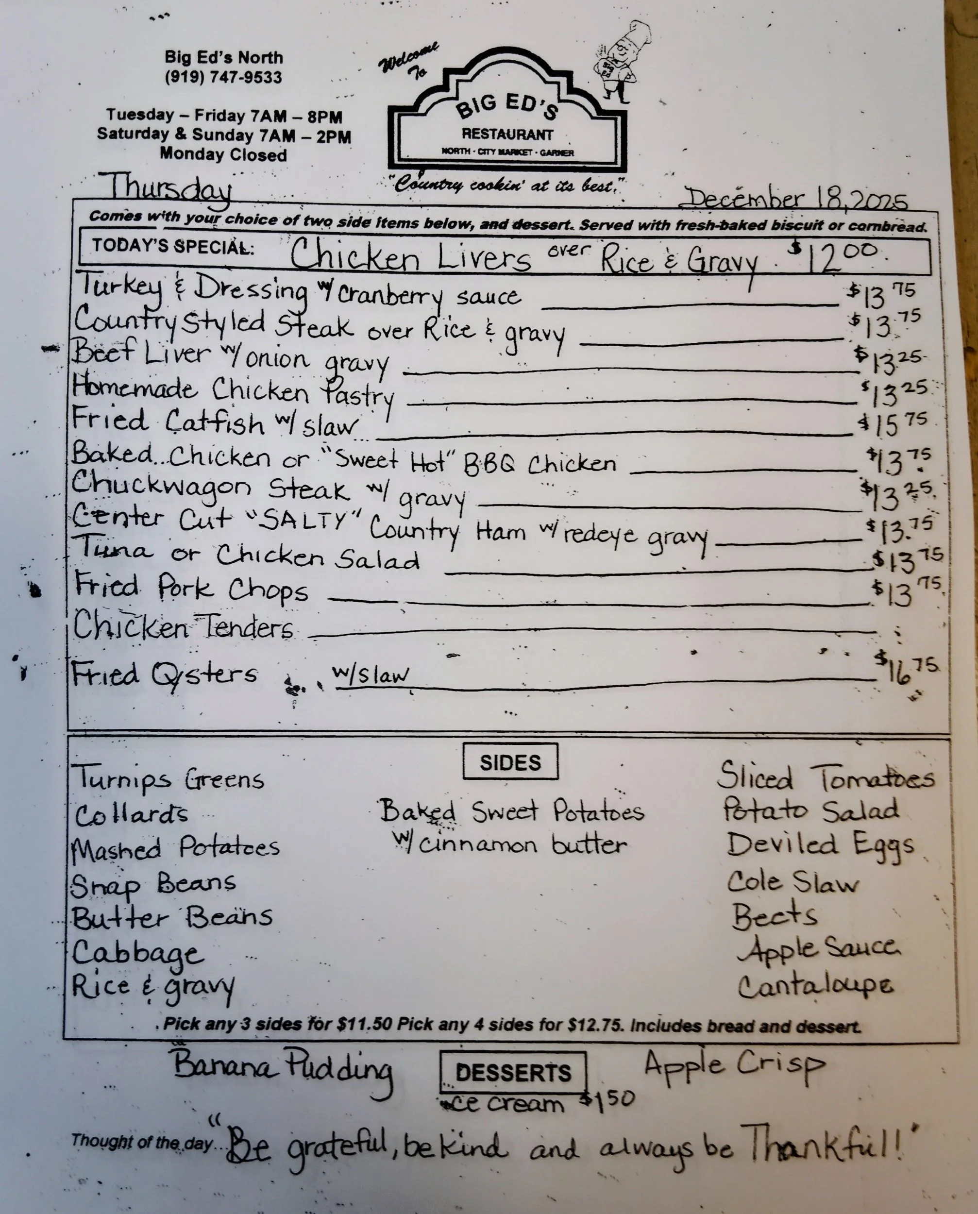 December 18, 2025 Big Ed's December 18, 2025 Big Ed's “Be grateful, be kind and always be thankful!” Big Ed's