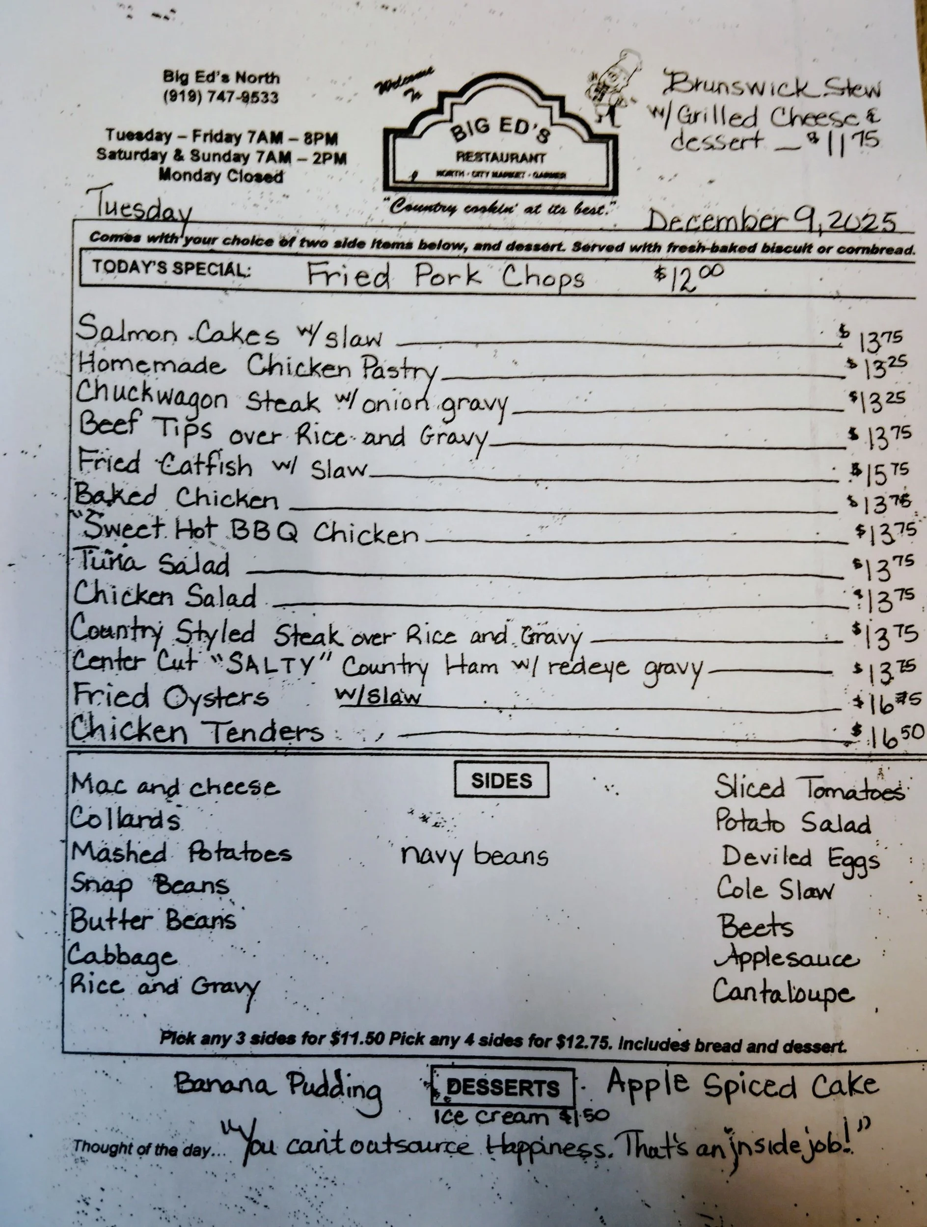 December 9, 2025 Big Ed's December 9, 2025 Big Ed's “You can't outsource happiness. That's an inside job!” Big Ed's