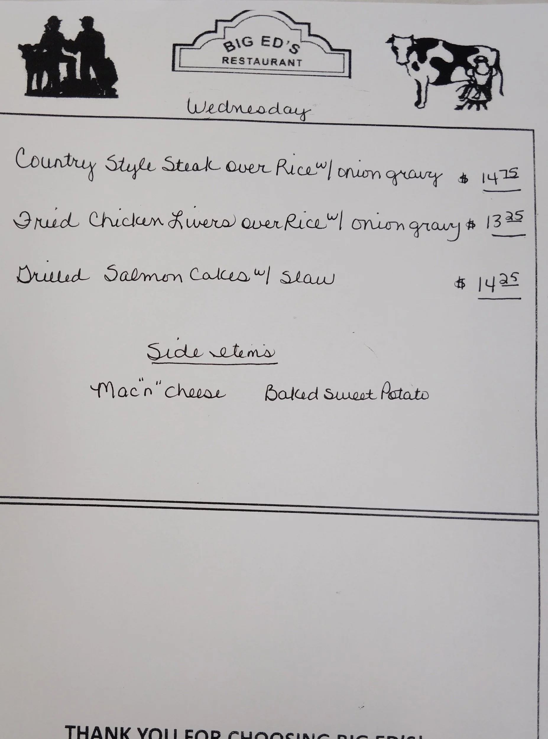 April 15, 2026 Big Ed's April 15, 2026 Big Ed's “Be not afraid of growing slowly; be afraid only of standing still!”North Raleigh’s Southern Country Cooking and Breakfast at its Best! Big Ed's